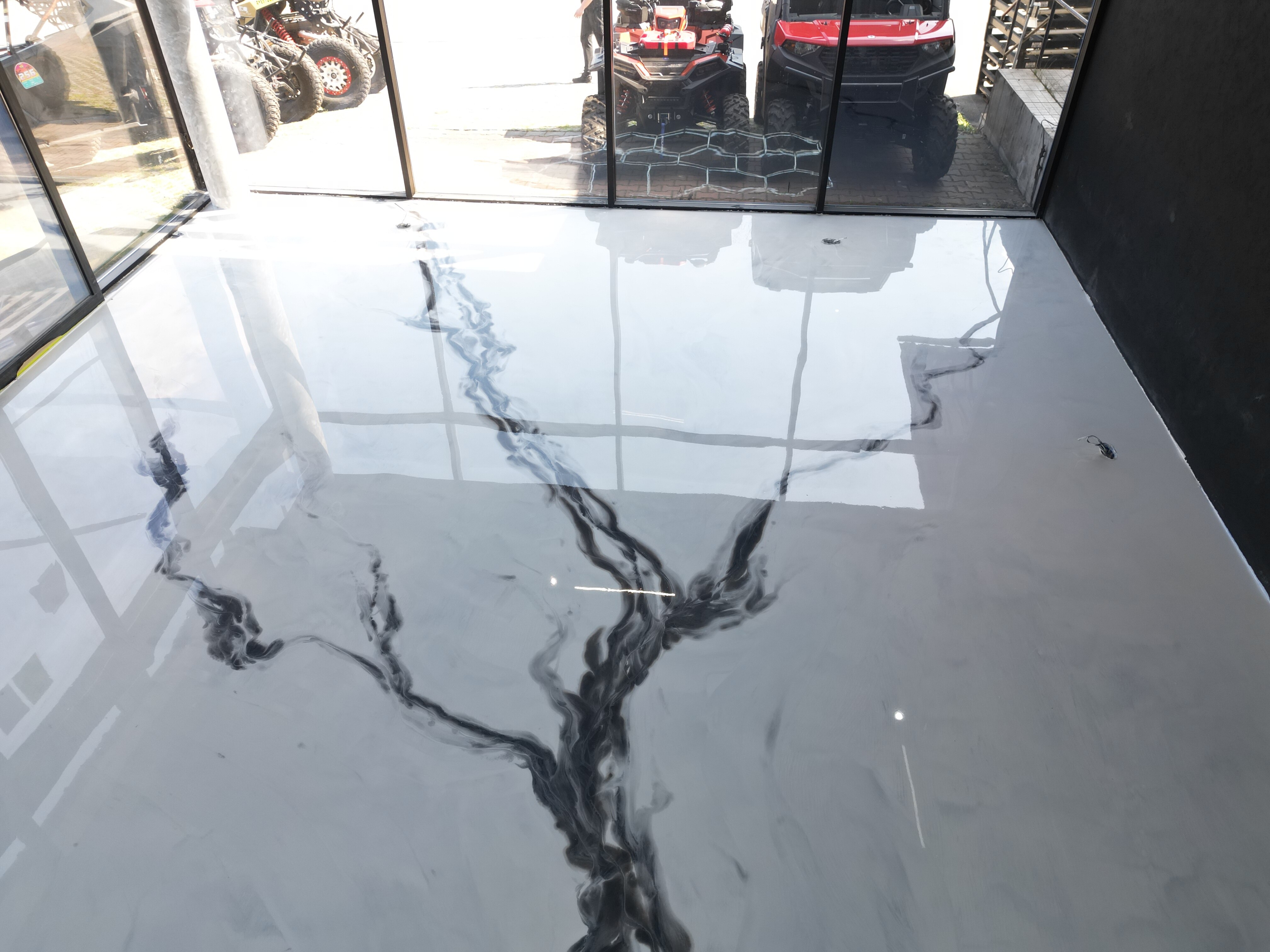 Na powierzchni ponad 350 m² wykonaliśmy unikalną posadzkę żywiczną z 55-metrową, nieprzerwaną żyłą marmuru, prowadzoną przez całą długość wnętrza w jednym, spójnym wzorze.